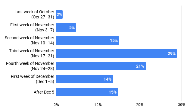 The majority of respondents (79%) believe that bonuses won’t be announced until mid-November or later. The most popular prediction (selected by 29% of associates) is the week before Thanksgiving. This (sort of) lines up with past precedent set by Cravath in recent years — if we assume that Cravath will be the first firm on bonuses this year, that is.