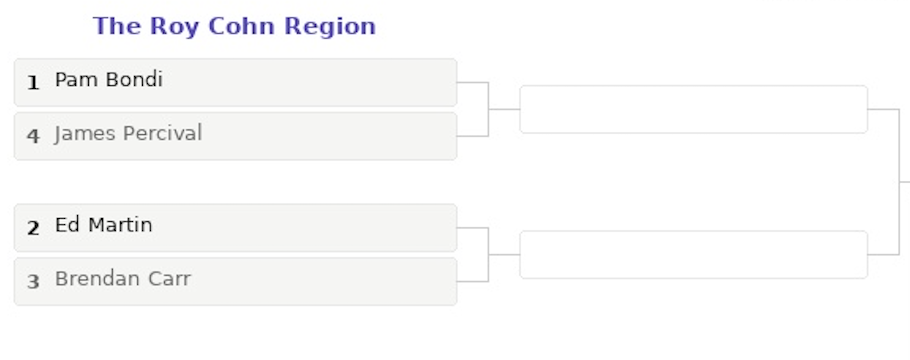 Here’s how this works. We’ve seeded 16 current and former administration lawyers into a bracket with four regions. Each region is named after a Trumpworld legal luminary of the past. We pay homage to the legal minds whose professional — for lack of a better term, judgment? — inspired and continues to inspire this regime.